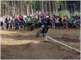 Wie immer hieß es für die Fahrer, nach dem track walk am Freitag zur Besichtigung der Strecke am Nachmittag dann das erste Training zu absolvieren. Für den RC 50 Erlangen gingen zu diesem Lauf fünf Fahrer an den Start. In der Klasse der elite women die Schwestern Kim und Liz Schwemmer und bei den elite men Wolfgang Eysholdt und Timo Pries und bei den Hobby Junior Fahrern Robert Pietschner. Die vier Lizenz Fahrer kamen beim Training mit der doch sehr anspruchsvollen Strecke sehr gut zurecht, was im Seeding Run am Samstag dann etwas anders aussah. Auf Regen nasser Strecke belegten die Schwemmer Schwestern Rang sieben und acht und auch für die männlichen Fahrer waren nur die Plätze 39 Pries und 43 Eysholdt zu verzeichnen. Pietschner kam in der Hobby Klasse als 52. über die Ziellinie. Ein wenig frustriert von diesem Ergebnis, das die Startaufstellung für Sonntag, das eigentliche Rennen bedeutete ging es dann am Sonntag morgen erst einmal wieder zum Training bevor um 12 Uhr die Rennläufe starteten. Die Hobbyklassen werden zuerst gestartet. Robert Pietschner konnte hier 13 Sekunden zu Vortag gut machen und kam mit einer Zeit von 2:43 auf den 39. Platz der Junior Klasse. Kim und Liz Schwemmer gingen als erste Lizenzfahrer auf die Piste, die sich schon sehr viel „ausgebombter“ jedoch merklich schneller als am Samstag präsentierte. Die Deutsche Vizemeisterin Kim konnte an diesem Wochenende jedoch nicht ihre gewohnte Leistung abrufen und belegte mit einer Zeit von 2:38 den fünften Rang, Liz kam auf Rang sieben. Nach etlichen Fahrern kam Eysholdt auf die Stecke, zeigte sich gut, fand jedoch wie er selber sagte nie seine perfekte Linie und ging mit einer Zeit von 2:19, gute acht Sekunden schneller als am Vortag, als 49. über die Ziellinie. Diese Zeit zeigte schon die höhere Geschwindigkeit die hier gefahren wurde. Nur zwei Fahrer später war Pries an der Reihe, der mit diesen Bedingungen ganz gut zu recht zu kommen schien, so kam er mit sauberster Linie in die Wiesenkurve, an der sich die Fan nur so ins Zeug legten. Bei tobendem Publikum bog er ab in den Wald und kurze Zeit später war über die Lautsprecher schon die neue Bestzeit verkündet. Timo Pries konnte es sich nach diesem guten Run mit einer Laufzeit von 2:12 erst einmal als zeitschnellster im Hot Seat bequem machen. Dort verbrachte er eine ganze Zeit bis diese Zeit geknackt wurde. Letztendlich hieß es für ihn Rang 16, was seine konstanter werdenden Leistungen unterstrich.